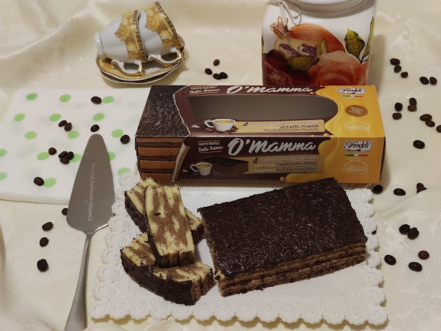 Ora passiamo alla novità e cioè la Briosa torta di Pan di Spagna con 3 strati di farcitura al Caffè Napoli, ricoperta in superficie da fiocchi di Cioccolato nero fondente.